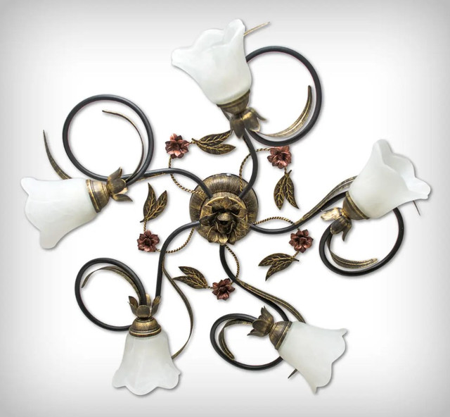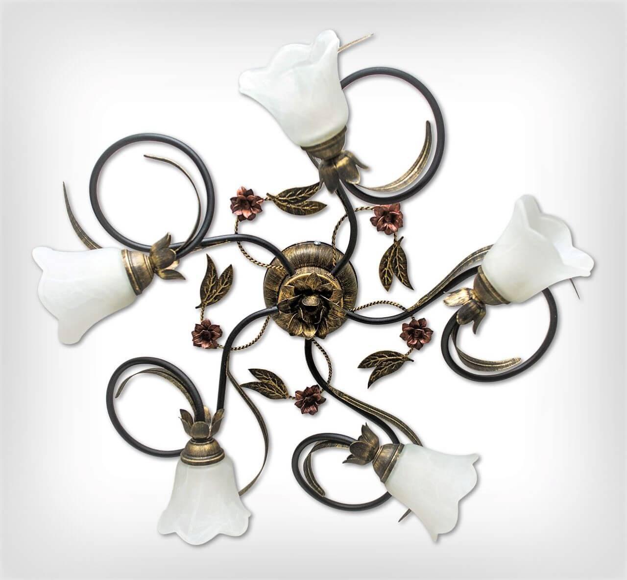 Цей світильник на 5 ламп виготовлений у стилі флористика. Найкраще підходить для приміщень заввишки 2,5-2,7 м площею 15-25 м кв. Стане прикрасою класичного інтер'єру вітальні, спальні, кухні.